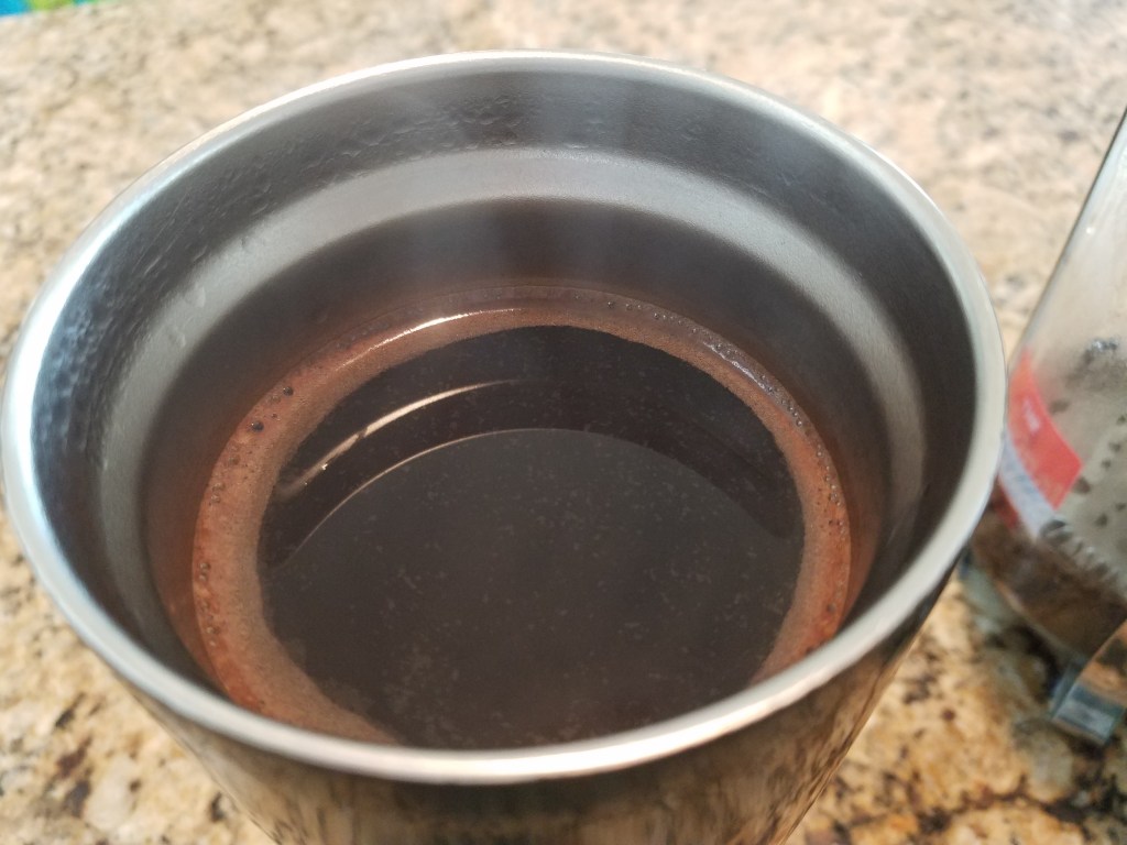 18 oz water is heated in an electric kettle. The coffee grinds are added to a french press, and just-under-boiling water was added on top of the grounds. This was allowed to brew for between 4 minutes and 30 seconds before being poured into a mug or thermos.