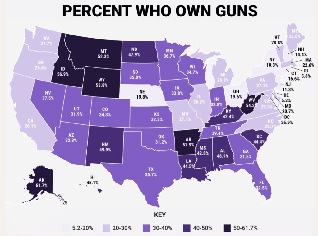 Worth mentioning, this data is based on murder rates per 100,000 people to make this comparison fair. If the narrative we’re constantly being fed on gun violence was true, we would see the exact opposite on these two maps. “People are bringing guns in from other states, that’s why gun control doesn’t work. We need to have the same laws in all states to make this work.” Okay, that makes sense on the surface, but why aren’t all the areas where people are bringing in these guns experiencing the same levels of crime? By this logic, the more guns that are accessible, the higher the murder rate will be, but this simply isn’t the case.