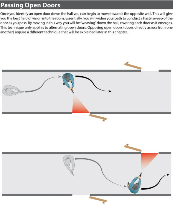 Regardless of the scenario, the corkscrew method is the only viable technique for clearing halls alone and addressing open doors. While it isn’t perfect, it’s your best bet. Again, Special Tactics has a great illustration for this: